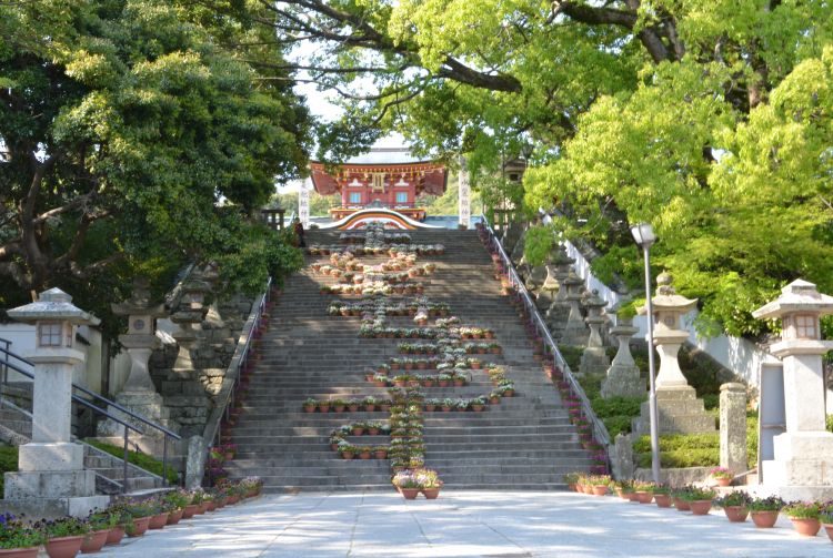 从四月到五月,神社会举办“幸福周”,在此期间,您可以欣赏台阶上布置的色彩缤纷的盆栽。