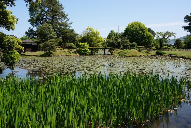 庭园中心是一座大池塘,池塘周边种有许多树木、灌木与花卉。春季,樱花绽放;夏季,四座小岛之间的水池开满了睡莲。在秋季,树木披上深红色与黄色的叶子;而在冬季,白雪覆盖大地。
