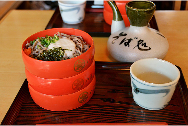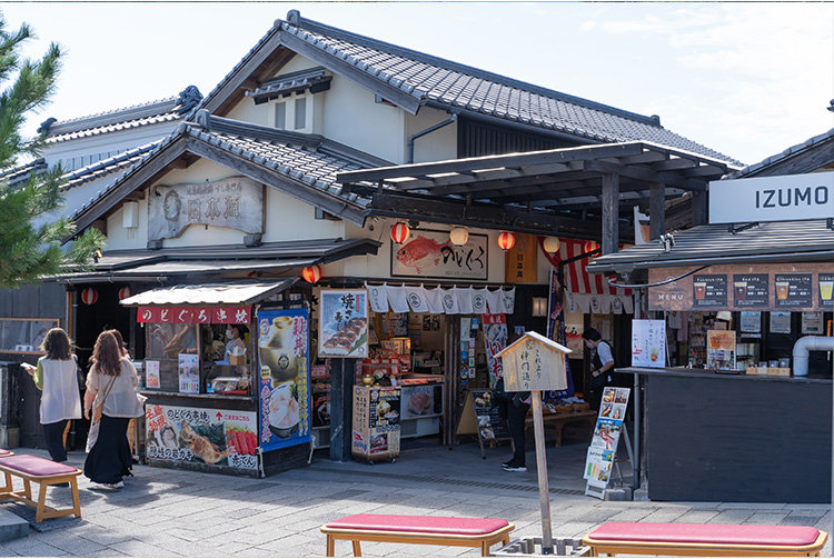 从一之鸟居到二之鸟居,神社的参道长约 700 米,两旁有许多纪念品商店和咖啡馆供您参观。该地区也以出云荞麦面闻名,您可以在大社周围的几家餐馆品尝。这里的荞麦面通常装在三层容器中,颜色较深,配上甜美的深色浓汤,有别于日本其他地方供应的荞麦面。