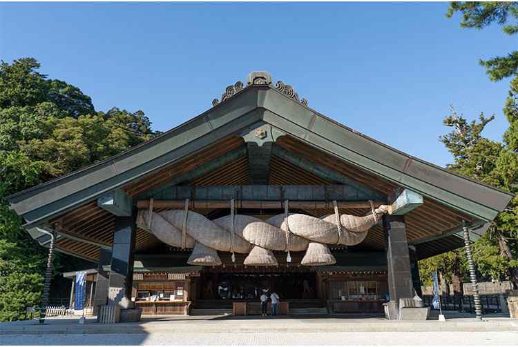 根据日本传说,出云大社供奉的是结缘之神大国主大神。这位神明不仅为人类牵线搭桥,还在所有生物之间建立起联系,以便大家共同繁荣。出云大社还有日本比较大型的注连绳,这是一种以稻草编织而成的绳索,多悬挂在神社和宗教场所等神圣的地方,以除秽辟邪。