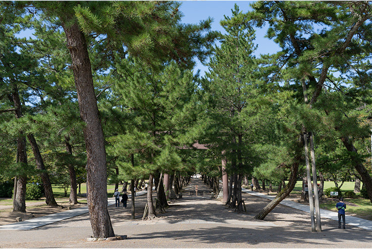 - 沿着长满参天松树的参道边沿行走,因为参道中央被视为神明之路