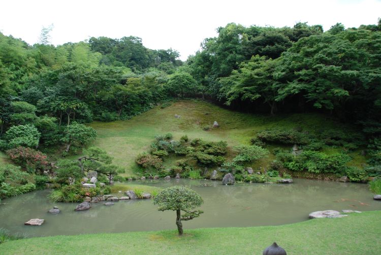 在观音院的露台上欣赏日式园林,这座园林是这座神圣寺院的焦点。以大池塘为中心的四周是修剪整齐的草坪和松林,中间是石岛,象征鹤和龟。