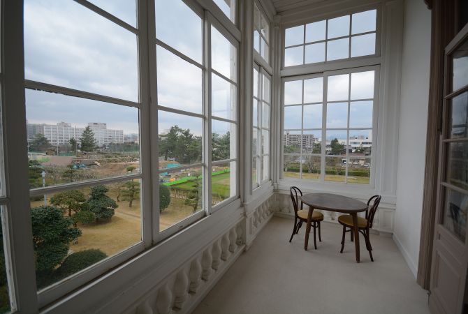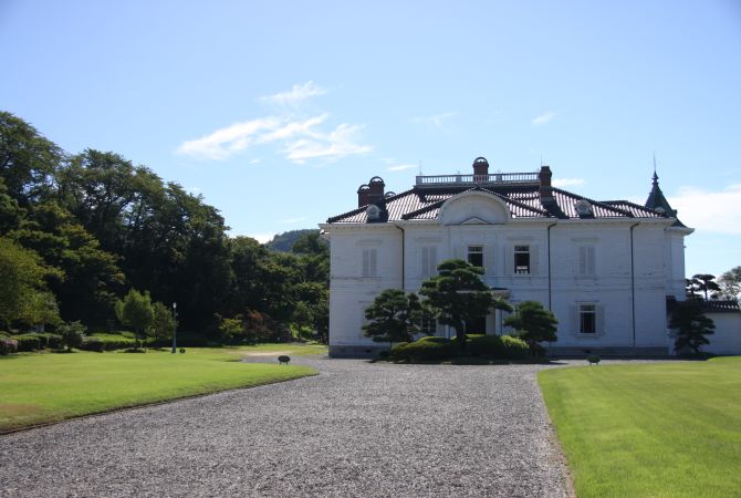 这座精致优美的两层木制建筑由著名建筑师片山东熊 (1854-1917) 设计打造,于 1907 年建成。其主要特色是白色外墙、巨大的支柱以及可以俯瞰花园和池塘的阳台。内部也经过精心装饰,配有精美的窗帘盒和壁炉架。