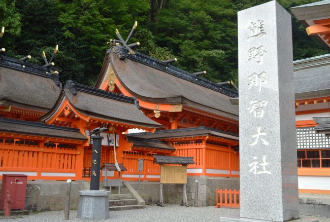 在纪伊胜浦站搭巴士,约 30 分钟后到那智山站下车。前一站是那智之泷站,是前往那智瀑布的车站。或者可以在新宫站搭巴士 15 分钟,在神社寺前站下车